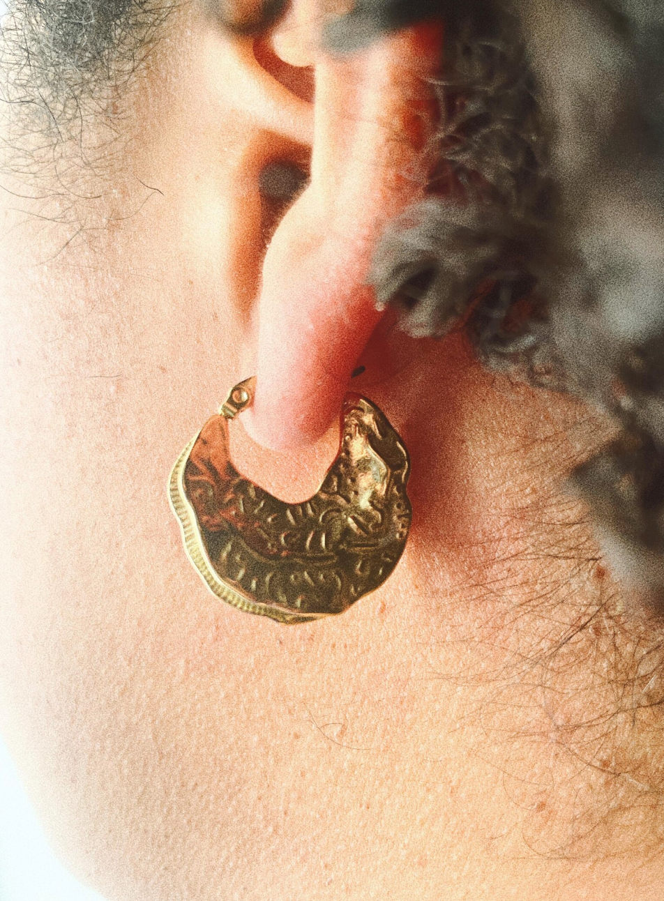 Meet the bold and beautiful "Crescent" hoops—a funky little gold hoop earring that feels like a lucky charm and a time traveler rolled into one. With their textured, antique-inspired crescent shape and soft gleam, these vintage-style earrings bring effortless art fairy energy into every room.